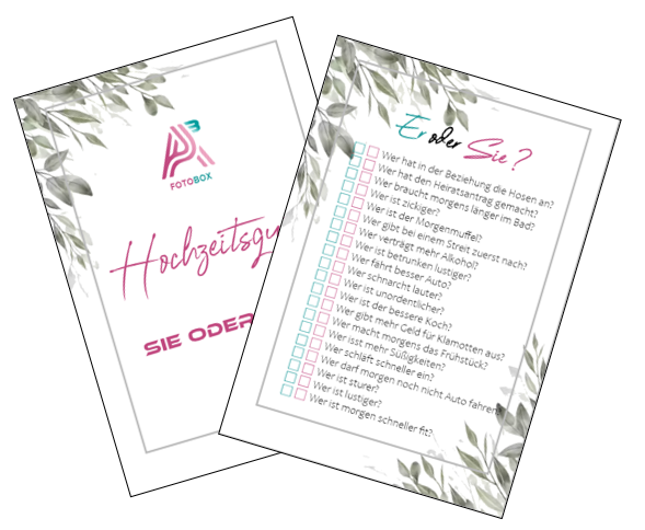 Das Hochzeitsquiz ist ein unterhaltsames Spiel, bei dem die Gäste ihr Wissen rund um die Liebesgeschichte des Brautpaares testen können. Von witzigen Anekdoten bis hin zu kniffligen Fragen – wer weiß am meisten über das Paar? Das Quiz sorgt nicht nur für viele Lacher, sondern bringt auch alle Gäste spielerisch ins Gespräch und lockert die Stimmung auf. Perfekt, um gemeinsam schöne Erinnerungen zu schaffen!
